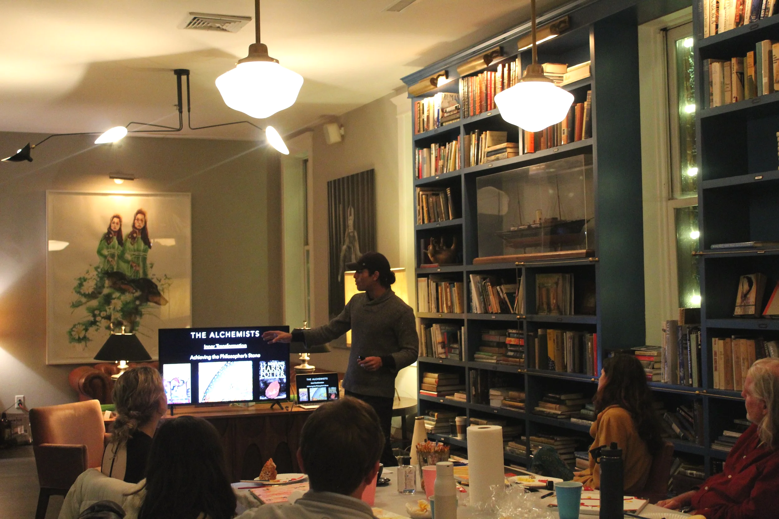 Joseph from Humble-U Media giving a presentation titled 'The Alchemists' to a small audience in a cozy, book-filled room with warm lighting and bookshelves.